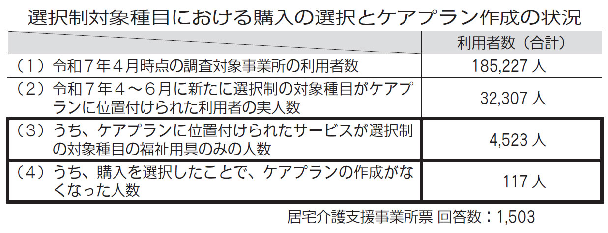 居宅介護支援事業所で25年4~6月に選択制の対象種目がケアプランに位置付けられた利用者3万2307人のうち、ケアプランのサービスが選択制対象の福祉用具のみの利用者は4523人。うち、「購入を選択し、ケアプランの作成がなくなった利用者」は117人で、選択制対象種目の福祉用具のみの利用者に占める割合は2・6%だった。福祉用具のみのプランでも、購入を選択するケースは少ないということだ。