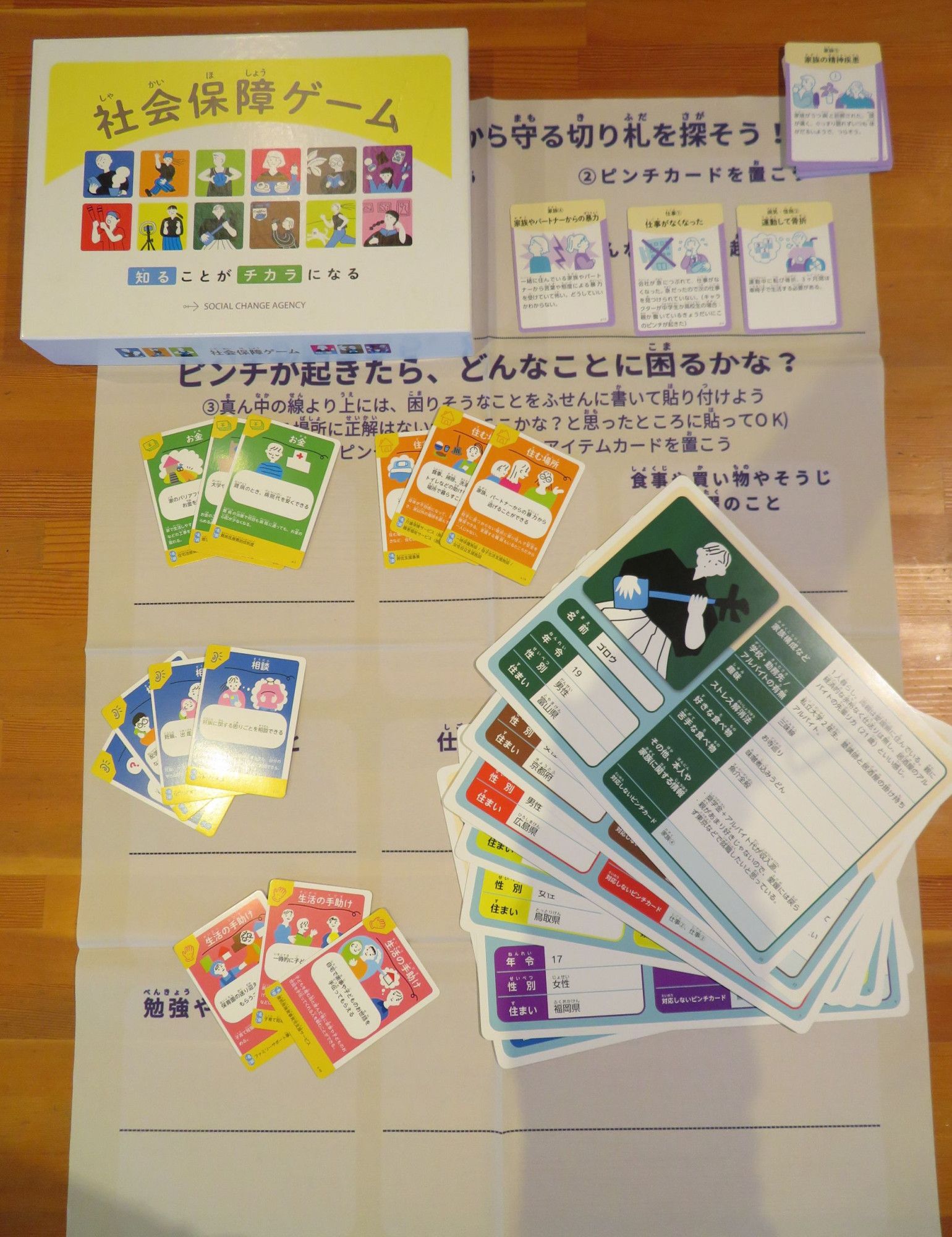 社会保障ゲームは、キャラクターが陥るあらゆるピンチによって起こる困り事を想像し、学生同士で相談しながら各種制度・相談窓口が書かれたカードの中から役に立ちそうなものを探すゲームだ。